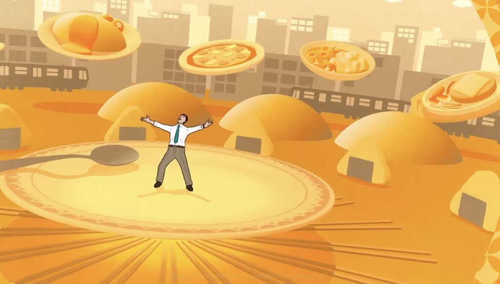 野原ひろしが、視聴者に気づいたような視線から、両手を広げるとお背景に食べ物や食器が並ぶ領域へと展開されます。