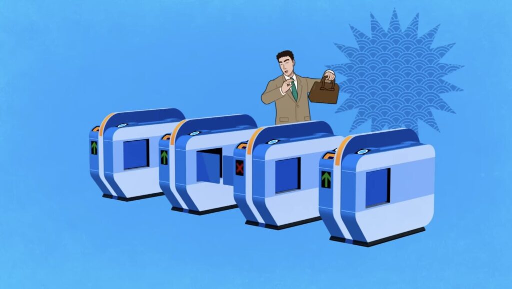 開始27秒で野原ひろしが無賃乗車に失敗する映像が流れます。